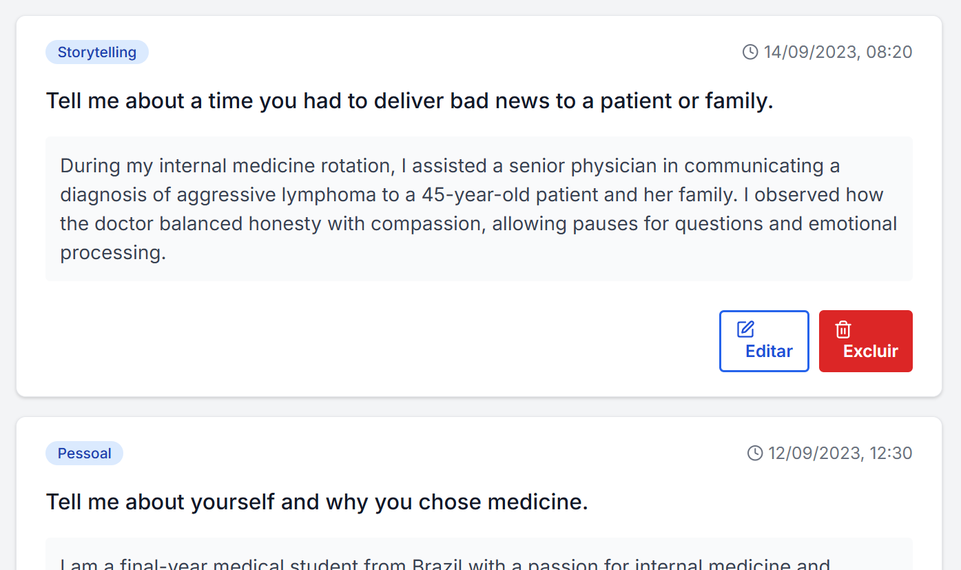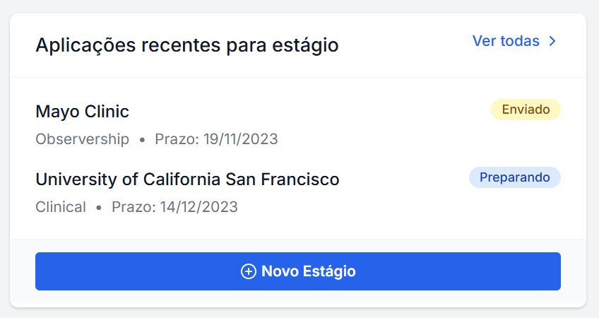 Organize tudo: datas, cartas enviadas, prazos, tipos de estágios, retorno dos hospitais.🟦 Visualize todas as suas oportunidades num só painel.