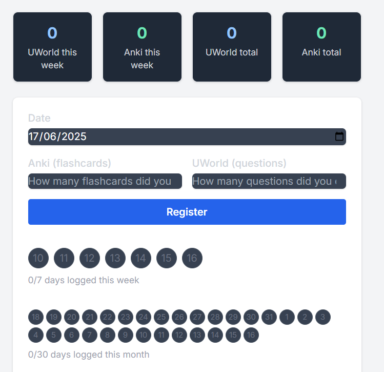 Mark your UWorld and Anki usage days.