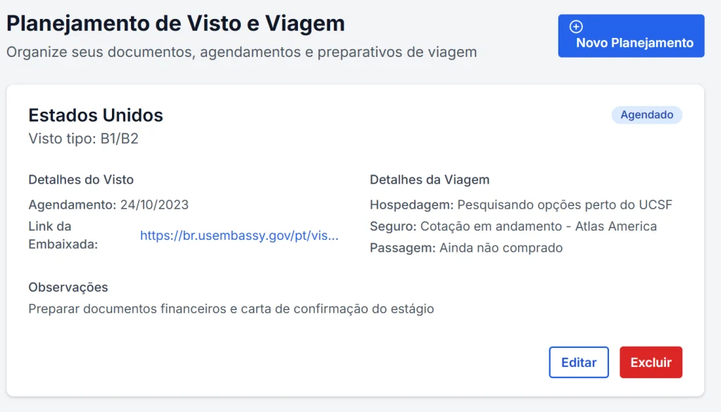 Checklist interativo de toda documentação e planejamento da viagem.✈️ Desde o DS-2019 até a hospedagem e seguro saúde.